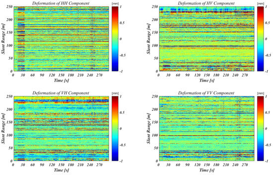 where mA and A are the mean value and standard deviation of the amplitude samples of the pixel along the waveform, respectively. Precise statistical hypotheses allow one to relate DA to the phase dispersion. When a point target is illuminated at different times, the amplitude of the signal backscattered from a stable point and affected by additive noise is rice distributed. In Figure 2, the black star indicates the chosen coherent scatterers. The real aperture radar detected no movement along the azimuth direction with a high pulse repetition frequency (PRF) rate but at a cost: no azimuth resolution. All targets within the antenna beam with the same slant range were recorded together, making it difficult to identify the corresponding target from the radar diagram. One solution is a full polarimetric analysis. The full polarimetric responses hold the maximum information of the scatterers, and all the polarimetric information can be written into a scattering matrix. Several methods that were previously used to decompose the polarimetric scattering matrix are now used on parameter spaces that are phenomenologically more significant [47]. In this particular scenario, complete polarimetric information might be used for target identification and categorization based on these methods. For additional investigation, the absolute amplitude of these coherent scatterers was employed in Figure 4a. The absolute amplitude of the HH component is located on the horizontal axis, while the absolute amplitude of the VV component is located on the vertical axis. The coherent scatterers are dispersed down the horizontal axis, as this image shows. This indicates that the replies for the HH component were substantially bigger than those for the VV component. We inferred that the horizontal construction of the bridge was the source of these reflections because of the acquisition geometry. Moreover, H/Alpha analysis was carried out based on the full polarimetric responses of the coherent scatterers. The alpha angle may be used to determine average scattering processes, and entropy is a natural measure of the intrinsic reversibility of the scattering data. By taking various scattering behaviors into account, the H/Alpha plane may be separated into nine fundamental zones, which will help to segregate the data into a basic scattering mechanism [48]. The backscattered signal identifies dominant scattering processes, which are represented by the pixel indices in each zone, separately [49]. From the results of the H/Alpha analysis shown in Figure 4b, we can see that most of the coherent scatterers arose from the region with low entropy and high alpha values. This probably means that the reflections arose from similar dihedral reflector- or dipole-shaped targets. Based on this analysis, a dipole-like target (red dot in Figure 4a,b) was selected, which we stated would be the horizontal needle beam located 14.5 m from the system to the bridge. The displacement profile corresponding to this target located at the range distance R = 14.5 m is displayed in Figure 5. The maximum displacement value around 2.5 mm is shown. The negative displacement means that the displacement was toward the radar position. After the train crossed the bridge, small, damped oscillations were observed.