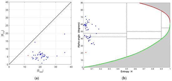 (a) Polarimetric data distribution in HH and VV components of RCS. (b) Polarimetric data distribution of the bridge in the 2D H/Alpha plane. Red dot indicated the selected reflection point located at 14.5 m; Blue dot indicated others reflection points.
