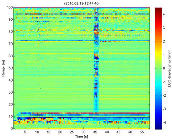 The acquisition lasted approximately 300 s. The RCS consistently drops with the increasing distance because of the acquisition geometry and the bridge’s scattering characteristics. The detected bridge reaction starts at a range of 20 m. Figure 3 displays the appropriate temporal trends of the LOS displacement. Each profile was identified by the range distance of the target to which it refers. It can be observed that, between 180 s and 270 s, in each of the range profiles that match the objectives on the bridge, displacement was measured. Only a few of the structure’s reflection sites were able to extract precise displacement time series due to the signal-to-noise ratio (SNR).