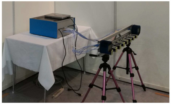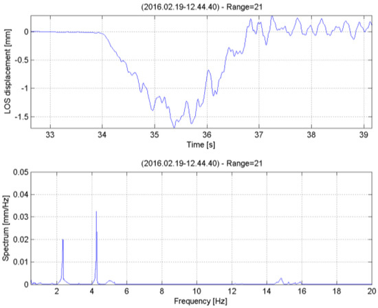 Figure 10 provides more detailed information on the profile measured at range R = 21 m when the train was crossing the bridge. A sequence of peaks was observed after t = 35 s, probably related to the passage of the different train coaches. At the bottom of Figure 10, the power spectrum of bridge displacements is reported. Two peaks could be observed at frequencies of and .