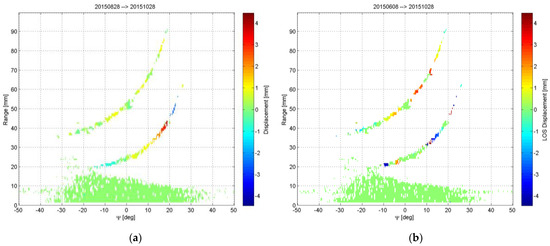 (a) LOS displacements measured at the stone bridge between 28 August and 28 October 2015. (b) LOS displacements measured at the stone bridge between 8 June and 28 October 2015.