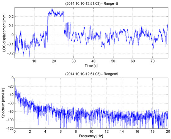 The large stone pillars located in the river and those close to the riverbank appeared stable in both the displacement maps. In contrast, displacements in the corresponding bridge arches were measured. Displacements of 1 mm and 3 mm were measured between 28 August and 28 October 2015 and between 8 June and 28 October 2015, respectively. A positive displacement indicates movement away from the radar. It is worth noting that measured displacements corresponding to the lower curve probably contain only the component caused by the thermal variations of the metallic girder on the top of the concrete pillars, located between the radar location and the bridge (see Figure 11). The bridge was also studied using a RAR configuration, with the radar installed below one of the bridge arches and the TX/RX antennas pointed almost vertically toward the bridge, to measure possible vertical deformation when a truck crosses the bridge. Figure 14 shows the RCS profile of RAR measurement. The peak in the radar response was at around . The LOS displacement profile and the corresponding frequency spectrum measured at this range distance are reported in Figure 15. It can be observed that the maximum vertical displacement of the bridge was about 0.2 mm from the radar and not toward the radar, as expected. Furthermore, the frequency spectrum showed no frequency peak.