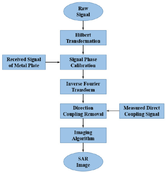 The developed SFCW-based MIMO array radar system is shown in Figure 16. The system includes eight spiral antennas as transmitters and eight Vivaldi antennas as receivers. Its working frequency ranges from 3.81 to 8.01 GHz with 1024 steps (adjustable; the minimal number is 8), resulting in a range resolution of 3.53 cm and a maximal unambiguous range of about 36 m. The length of its equivalent uniform array is approximately 0.89 m, yielding an angle resolution of 0.028 rad. The data sampling rate of this system is about 8 Hz, which is faster than that of commercial GB-SAR systems. More detailed information on this MIMO radar system can be found in [50]. For the designed MIMO array radar system, the time division multiplexing (TDM) approach was used to achieve transmission orthogonality (i.e., each transmitter transmits the same SFCW signal sequentially using a switch network, and a delay compensation method was used to reduce the negative influence of time synchronization error). More detailed information relating to this MIMO radar system can be found in [50]. The signal processing flowchart for the designed MIMO radar system is shown in Figure 17.