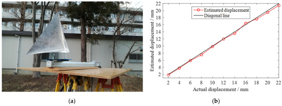 Setting three trihedral corner reflectors (CRs) as the targets, the MIMO radar imaging result obtained by the back projection (BP) algorithm is shown in Figure 18. It can be seen that three CRs could be well focused and distinguished. Further, we mounted a CR on a linear scanner that can be controlled with an accuracy of 1 μm, as shown in the left figure of Figure 18. Along the LOS direction, the CR was moved away from the designed MIMO radar system, from 2 to 22 mm, with a 2 mm step. The displacement estimation result is shown in the right figure of Figure 19, where the root mean square error of the estimated displacement was about 0.37 mm, which proves the feasibility of the developed MIMO array radar system.