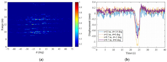 Thereafter, differential interferometric processing was conducted to estimate the displacement of four different points of the bridge. These four selected points had the highest amplitudes, which resulted in acceptable estimation precision, and different ranges and angles from which to verify the 2D separation capacity of the designed MIMO radar system. The displacement estimation results are also shown in Figure 21, from which it can be observed that these four points experienced different displacements along the LOS. Moreover, different from the RAR measurement shown in the above section (which can provide good range resolution only and thus loses information in the azimuth direction), the 2D imaging capacity and fast data sampling rate of the designed MIMO radar system make separation of the targets in both the range and azimuth directions possible. Thus, more accurate displacement estimation can be achieved.