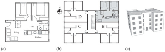 (a) Floor plan of the representative flat, (b) representative typical floor and (c) 3D image of the building. The capital letters represent the different orientations of the typical flat. Source: Triana et al. [6].