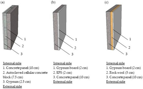 Energy efficiency measures for (a) external wall with autoclaved cellular concrete block, (b) external wall with EPS and gypsum board and (c) external wall with rock wool and gypsum board.