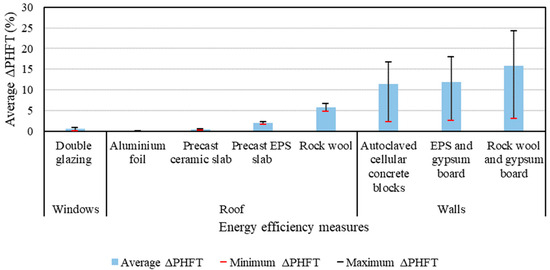 Minimum, average and maximum increase in the percentage of occupied hours within the operative temperature range due to energy efficiency measures, where ΔPHFT is the increase in the percentage of occupied hours within the operative temperature range in relation to that of the representative model.