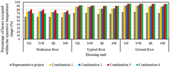 According to INI-R [9], the envelope has Class A energy efficiency without air-conditioning systems if the occupied percentage of hours within the operative temperature range is higher than 95%. Only the flats on the ground floor achieved this performance in combinations 5 and 6 (Figure 5). Therefore, with none of the combinations, achieving a Class A rating of energy efficiency of the envelope in all flats was possible without considering air-conditioning systems.