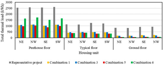Figure 5 shows the percentage of occupied hours within the operative temperature range for the flat evaluated, comparing the performance of the representative model with and without the combinations of energy efficiency measures. These combinations also met the criteria for maximum operative temperature, minimum operative temperature and total thermal load (Figure 6) for the upper level of thermal performance.