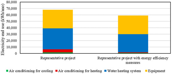 When comparing the representative model with and without energy efficiency measures (Figure 7), the electricity consumption reduction was 8947.6 kWh/year (13.1%). When the end-uses were analysed separately, the most significant reduction was in consumption with air conditioning for heating (78.2%), followed by air conditioning for cooling (32.7%). These two consumptions, however, have low representativity in the overall consumption. In absolute numbers, the most considerable reduction in consumption was with the water heating system, at 4558.0 kWh/year.