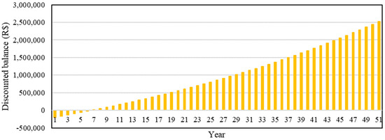 The net present value was BRL 2.5 million at the end of the analysis period, the internal rate of return was 18.7% per year and the discounted payback was approximately 5.7 years. Figure 8 shows the discounted cash flows of this analysis. The investment is considered economically viable, given that the net present value is positive and the internal rate of return is higher than the minimum attractive rate of return.