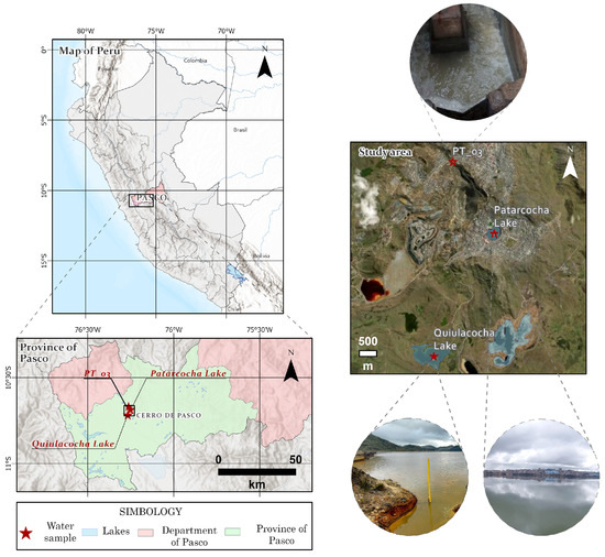 In Peru, the city of Pasco is located at an altitude of 4360 m above sea level and has an average perimeter of 1400 m [39]. This region is home to large reserves of water resources [1]. In the Pasco region, there is a significant negative impact of mining waste from the past, as well as catastrophic incidents in local ecosystems with serious impacts, causing a disturbance in the balance of the natural and social environments [40]. The notable effect of acidic waters generated by environmental liabilities in Pasco has led to a modification in surface and subway watercourses, as well as an alteration in the soil quality and a significant transformation in the landscape. Companies such as Aurex, Cerro SAC, and El Brocal discharged their industrial wastes into surface water environments, such as the Yanamate and Quiulacocha lakes (Figure 1), which, today, have become acid water and tailing deposits [40]. On the other hand, due to the high population of residents generated by mining activities, the disposal of untreated urban wastewater has become an urban management problem. Wastewater from the central and eastern parts of the city, which are located in the main commercial centers and hotels, is discharged to Patarcocha Lake, causing this lake to have a high rate of contamination [41].