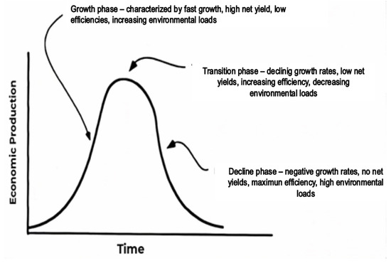 As illustrated in Figure 2, the different phases of growth and decline of a system can represent a human economy where there is a growth, transition, and decline in driving emergy sources. Practices and processes that are characteristic during the growth phase may not be sustainable during transition or decline because they rely on non-renewable energies that are declining. On the other hand, practices that are sustainable during decline, because they do not rely on non-renewable sources, are likely to be uncompetitive with rapidly growing systems [25].