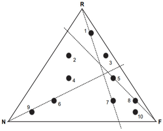 The ternary diagrams show important properties. When two different ternary compositions, represented by points P and Q within the triangle (Table 3), are mixed, the resulting composition will be represented by point X, which is called the “symergic” point [38]. Another important property of triangular diagrams is the importance of a straight line joining a vertex to a point on the opposite edge (Table 3). Any point along the indicated line represents a composition that is progressively poorer in N as it passes from A and B, but R and F remain present in the same initial proportion. Thus, if it is desired to represent the changing composition of a system, A, as the% N decreases, all that is needed is to draw a line from the apex, N, passing through point A. Any ternary system formed by adding or subtracting N from the above composition lies somewhere on this line, which is called the “sensitivity line” [38].