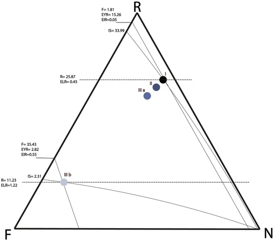 The locations of the sustainability points in the ternary diagram show the spatial difference between the four treatment scenarios. The emergy contributions of the treatments show that Treatment I has the largest contribution to the socio-environmental-economic system (Figure 4). For more detail, the emergy contributions, according to the ternary diagram, show that the fraction of renewable resources decreased considerably in the last treatment. The %R of Treatment I was 69%, the %R of Treatment II was 65.7%, the %R of Treatment IIIa was 61.6%, and the %R of Treatment IIIb was 21.8%; the fraction of non-renewable resources (%N) remained almost constant, as it was 26.13% in Treatment I, 24.89% in Treatment II, 23.33% in Treatment IIIa, and 9.50% in Treatment IIIb; and the fraction of imported inputs (%F) increased, where it was 4.84% in Treatment I, 9.37% in Treatment II, 15.04% in Treatment IIIa, and 68.72% in Treatment IIIb.