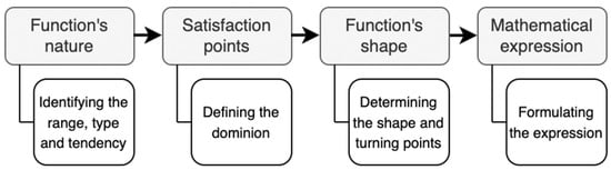 The development of the CVF consists of four distinct steps, as depicted in Figure 1. For each indicator under assessment, these steps are systematically applied in the following sequence: First, identifying the nature of the CVF by determining if it is positive, negative, or piecewise, which includes selecting its initial typology and tendency. Second, establishing the satisfaction points that delineate the CVF’s operational range. Third, deciding on the function’s shape—whether linear, concave, convex, or S-shaped. Lastly, formulating the mathematical expression that captures the essence of the value function. A description of each of these steps is presented in the sections below.