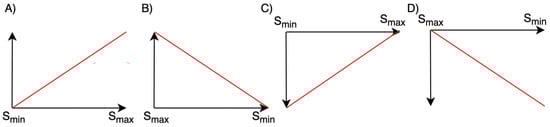 In the CVF definition process, the establishment of satisfaction points is a critical step, defining the dominion within which the function operates. These satisfaction points, denoted as Smin and Smax, represent the extremities of the function’s range on the x-axis in absolute value, as shown in Figure 2. This figure illustrates general examples of potential single CVFs along with their corresponding satisfaction points. For a CVF that is single positive and increasing, Smin and Smax are typically set at satisfaction values of 0 and 1, respectively. Conversely, for a single positive and decreasing CVF, the satisfaction values are reversed, with Smin at 1 and Smax at 0. In cases of strictly negative impacts, for a single negative and increasing CVF, the satisfaction values range from −1 (Smin) to 0 (Smax). Conversely, for a single negative and decreasing CVF, Smin is set at 0 and Smax at −1. Moreover, for functions that must encapsulate both positive and negative impacts—a piecewise positive–negative function—the satisfaction points can extend from −1 for Smin to 1 for Smax.