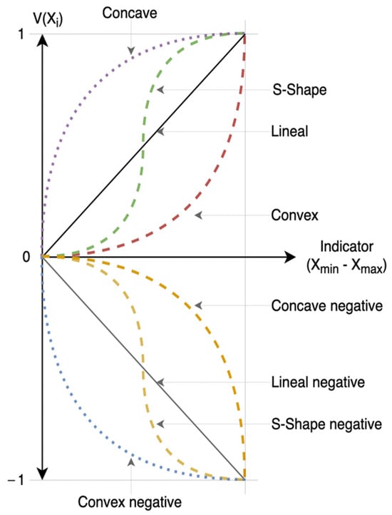 In scenarios where the indicator’s impact is unidirectional, the CVF will be single, meaning it is uniformly positive or negative across its range. For example, a positive increasing function could represent the percentage of green space in urban development, where a higher percentage directly increases satisfaction. A positive decreasing function might be applied to indicators such as energy consumption, where less energy use denotes higher satisfaction. Conversely, a negative increasing function could relate to the level of pollutants emitted, as higher emissions would decrease satisfaction. Finally, a negative decreasing function might be appropriate for an indicator like recovery time from a disaster, where longer recovery times result in increasingly negative satisfaction.