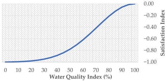 The shape of the CVF for the Water Quality Index is determined to be S-shaped (see Figure 4) with Smax = 100, Smin = 0, C = 50, K = 1.5, P = 2, a choice motivated by the nature of the water quality’s impact on satisfaction: a first phase where small quality changes are accepted, a second phase with a rapid decrease in satisfaction as the water quality moves away from the ideal condition, and a third phase in which the decision maker already shows practically minimum values.