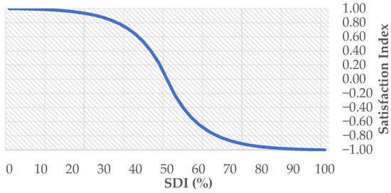 Considering the proposed example, Smax is set at the neutral point (SDI = 50%), where land degradation begins to have a noticeable impact on land productivity. Smin is determined at a critical level of degradation (SDI = 100%). The shape of the CVF is chosen to be convex with Smax = 50, Smin = 100, C = 50, K = 5, P = 1 (see Figure 6), illustrating high levels of dissatisfaction with low percentage losses of SDI, arriving at its minimum at nearly 85%, a point where the land’s ability to recover is significantly compromised and the negative impacts on ecosystem services are severe.