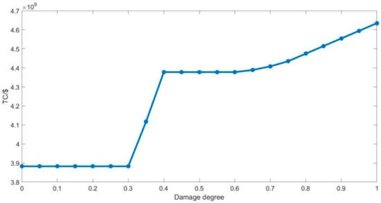 Total costs and different levels of damage (i.e., capacity loss) for the case study.