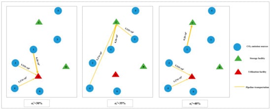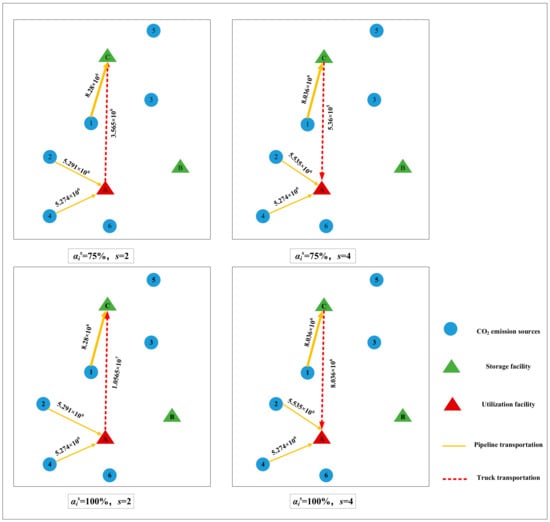 Figure 4 shows the optimal network structure for the case study with a facility capacity disruption with a 65–70% damage degree. From Figure 4, we can see that utilization facility A and sequestration facility C are both open. The associated flows are given in Table 10. As shown in Table 10, when the damage degree of facility A is 65%, since the CO2 flow transported from emission sources 2 and 4 to facility A via the pipeline is 1.0565 × 107 t, and due to the above-defined disruption, facility A thus cannot utilize 7.64999 × 105 tons (10.565 × 106–28 × 106 × 35%) of CO2. Therefore, our proposed stochastic optimization model suggests immediately transferring 7.64999 × 105 tons of CO2 from utilization facility A to sequestration facility C via tanker trucks. From the last two columns of Table 10, we can see that when the damage degree of utilization facility A is increased to 70%, its remaining utilization capacity continues to decrease, resulting in 2.165 × 106 t (10.565 × 106–28 × 106 × 30%) CO2, which is transferred to storage facility C by tanker trucks.
