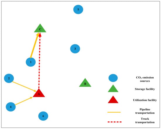 The CCUS supply chain network considered in this paper is shown in Figure 1. It consists of carbon emission sources, capture and treatment facilities, transport facilities and utilization and storage facilities [2]. In the considered CCUS supply chain system, carbon emission sources play the role of ‘raw material suppliers’, providing carbon dioxide as ‘raw material’ to capture facilities (equivalent to ‘producers’). Through the use of efficient capture technologies, CO2 is separated, purified and compressed into an easily transportable ‘product’, compressed CO2, which can be in a gaseous, cryogenic liquid, dense or supercritical phase. The compressed CO2 is then transported by road, railway, land pipeline, offshore vessels or submarine pipelines to storage sites or utilization facilities such as deep underground saline aquifers or, in some cases, for efficient use such as chemical production through CO2 hydrotreating or enhanced oil recovery through CO2-EOR technology, to achieve CO2 reductions from high-emitting sources.