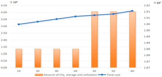 Figure 6 reports the trends of total CCUS SC cost and the total amount of captured CO2 with different parameter p values. Specifically, parameter p is set as 10, 20, 30, … 60. The detailed computational results are presented in Figure 6. As can be seen from Figure 6, as parameter p increases from 10 USD/t to 60 USD/t, the total CCUS SCN cost increases continuously from USD 3,130,250,000 to USD 4,068,690,000, leading to about a 32% increase in total CCUS SC cost. This shows that parameter p has a large impact on the total CCUS SCN cost. In addition, we can see from Figure 6 that if the value of parameter p is not higher than 45 USD/t, the amount of captured CO2 (which is transported to storage/utilization facilities) remains unchanged while meeting the CO2 reduction target, i.e., Tmin = 18.845 × 106 t. But, if the value of parameter p is higher than 45 USD/t, then the unit cost of CO2 for storage/utilization is lower than the value of the tax required to be paid for the release of CO2 into the atmosphere, thus the amount of captured CO2 increases to 19.089 × 106 t, which is a little higher than the required CO2 reduction target. From these results, we can conclude that setting suitably higher carbon taxes could encourage companies to actively reduce CO2 emissions without a significant increase in total cost, with minimal impact on the total cost increases, while relatively lower carbon taxes may not push companies to reduce CO2 emissions, as under such settings, the cost is sensitive to the changes in carbon taxes; a small increase in carbon tax may lead to a relatively greater increase in the total SC cost, which may have a negligible influence on the reduction of CO2 emissions.