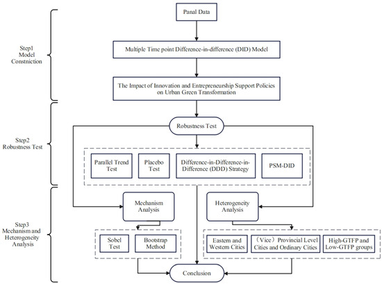 To explore the impact of implementing innovation and entrepreneurship support policies on urban green transformation, this study, referencing Tian et al. [79], employed a comprehensive model for investigation. The specific steps are outlined as follows.