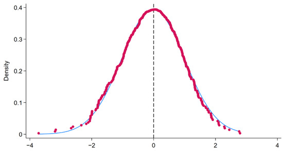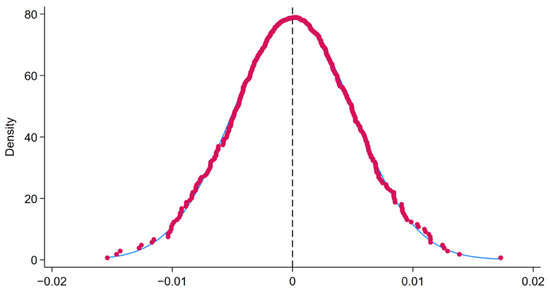 This study employed a placebo test by constructing a virtual placebo treatment group to eliminate the impact of other random factors. Initially, all 284 cities in the sample were randomly assigned as experimental and control groups. Regression coefficients and t-statistics were computed based on randomly generated experimental or control groups using Equation (7), and the process was repeated through 500 iterations. As depicted in Figure 3 and Figure 4, both the distribution of the regression coefficients and t-value estimates converge around zero and approximate a normal distribution. This observation indicates that the policy effects of the pilot demonstration bases for mass entrepreneurship and innovation are not incidental.