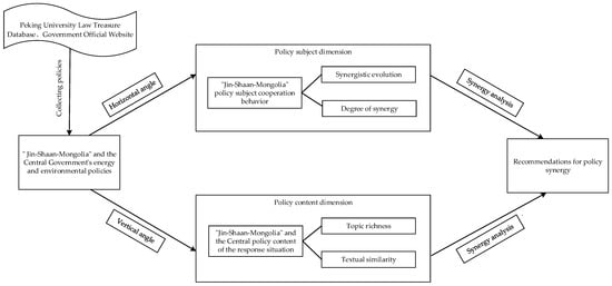 The synergy between different policy subjects can reflect the inheritance and development of policy intention, and have a strong explanatory effect on the policy–synergy relationship [42]; policy content synergy can reflect the actual effect of the realization of the policy text, which largely influences the quality of energy and environment polices’ synergy. This paper constructs the analytical framework of “policy subject—policy content”. The policy subject dimension mainly analyzes the synergy of different subjects at the same level in the region from a horizontal perspective, while the policy content dimension mainly analyzes the degree of synergy and response between Central and local policies from a vertical perspective. The basic framework is shown in Figure 1.