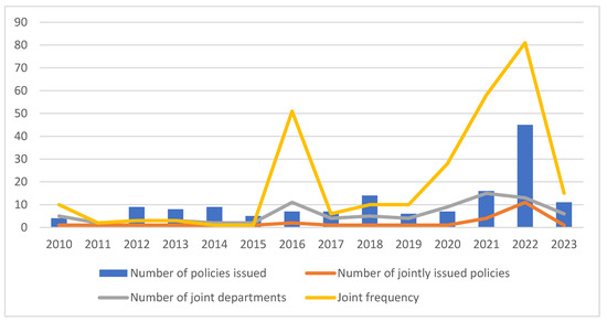 Horizontal policy-subject relationships are quantified by the number of joint local government departments, which refers specifically to two or more policy-issuing departments. Joint issuance, as a more specific type of policy form in government activities, is an important source of data for studying departmental cooperation [43]. In the analysis of synergistic evolution, the number of policy issuances, the number of jointly issued policies, the number of joint departments, and the frequency of jointness were counted for each year from 2010 to June 2023, respectively, and the collaborative evolution diagram of policy actors, concerning the structural ratio of policy issuances and multisectoral joint issuances, was drawn and analyzed.