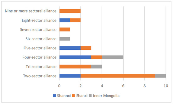 In Figure 3, the number of joint issuances in Shanxi is relatively high, with two to three subjects jointly issuing 10 documents, accounting for 62.5%. Not only can multi-sectoral coordination and mutual constraints be realized, but also the phenomena of mutually exclusive objectives and cross-management caused by the participation of too many departments can be avoided. The subject synergy of Shaanxi and Inner Mongolia is obviously weaker than that of Shanxi, with the number of joint issuances being 8 and 6, respectively, accounting for only a small portion of the total, and with four departments dominating the joint policy process.