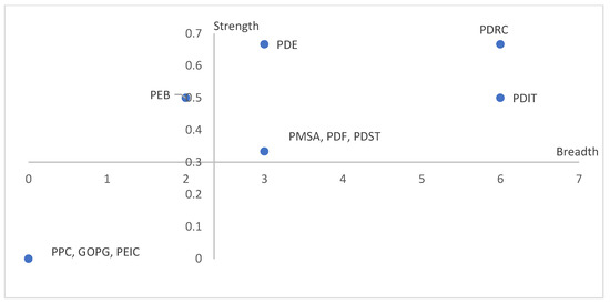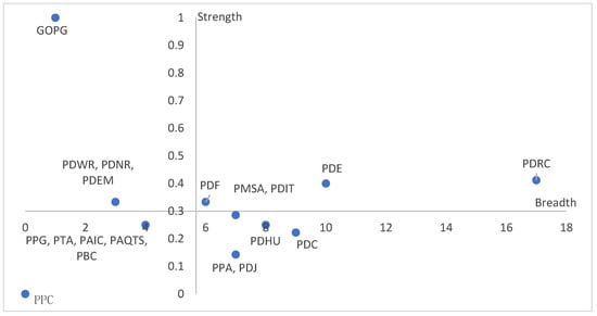 The GOPG has the highest synergy strength in the L–H quadrant and is an important functional subject, with limited cooperative subjects due to its sectoral attributes. The Provincial Department of Housing and Urban-Rural Development (PDHU), the Provincial Department of Commerce (PDC) and another six departments are in the H–L quadrant, with higher-than-average breadth but insufficient strength, and are important structural subjects. The synergy of these departments is mainly reflected in the fact that there are more subjects generating contacts, while the continuity of cooperation is poor, and the number of synergistic documents has not been increased concurrently. The breadth and strength of PPC are 0. As the highest local authority, they are in a meta-policy position, and are in a leading and being led relationship with other departments, which is consistent with the directional policy proposed by Han [38].