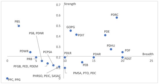 Shanxi has a synergy breadth maximum of 20 and a mean of 9.78; and a synergy strength maximum of 0.58 and a mean of 0.21. It contains 27 policy subjects, and the policy subjects are significantly more diversified than in Shaanxi. In Figure 5, 22% of the policy subjects with synergistic breadth–strength are above the overall average, contain six core subjects, and have a wide communication object and frequent cooperation. Among them, the number of joint departments of the PDRC and the PDE is 19 and 17, respectively, and the joint issuance occurs 11 and 7 times, respectively, which are the policy subjects with strong local synergistic capacity, high specialization in synergistic issuance, and strong continuity of cooperation.
