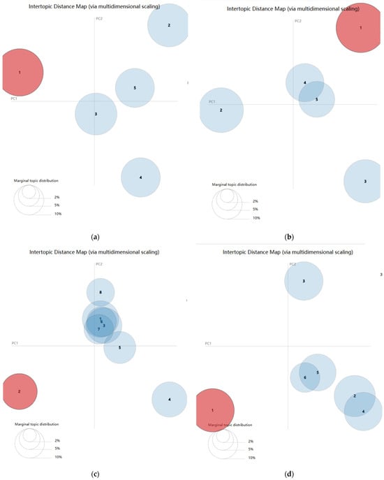 Policy topic richness (i.e., the optimal number of topics) is related to comprehensiveness and is the basis for policy synergy [48]. Through the theme consistency test, the optimal number of topics for the Central, Shaanxi, Shanxi and Inner Mongolia areas are initially determined to be 5, 5, 8 and 6, respectively. To observe the relationship between topics from the clustering effect and draw the LDAvis image, the distance between the bubbles indicates the degree of association between the topics, and the overlapping part of the bubbles indicates that there are cross-featured words in the two topics [49].