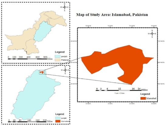 All of these characteristics make this study suitable for the assessment of environmental, economic, and social sustainability measurements. It has been noted that in the past few decades, the city has been losing its charm due to the rapid rates of population increase and urban expansion. This unplanned rate of urbanization challenges the area’s development and sustainability, which need to be addressed for regional sustainability and for the country’s development by keeping a balance between human activities and nature to achieve the UN’s goals for regional diversity. As a capital city, this area should be environmentally stable and economically and socially diverse. That is why this study provides some evidence for policy-making and developmental projects. Figure 1 shows the location of the study area in Islamabad, Pakistan.