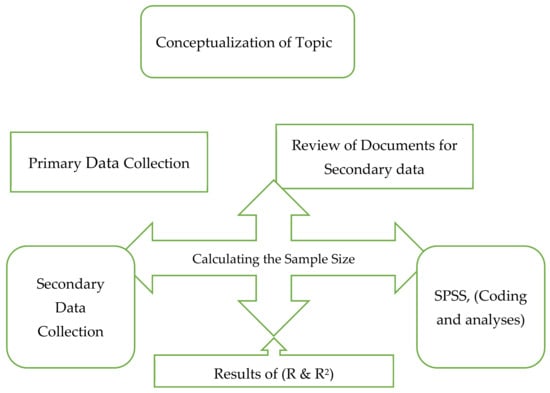 Secondary Data Collection: Based on primary data collected from the survey, the secondary data, including the revised master plan (2020–2040) of the city, documents of Capital Development Authority (CDA), land value records, urban gazette data, and published material in the past, were studied. After a very comprehensive review of all of these documents, the variables for secondary data were selected, including land values (LVs) in the area from the capital urban gazette, housing rent (HR) from property real estate dealers, job opportunities (JOs) in the area from the Federal Board of Revenue, ownership of house and vehicle (OHV), and size of the residency (SR) for economic sustainability measures. A Likert scale with points (ranging from 1, strongly agree, to 5, strongly disagree) was used to quantify the public opinions, including their levels of satisfaction, ranging from strongly agree to strongly disagree. Statistical Software for Social Sciences (SPSS, Version 23) was used for further analyses. Their correlation with urban sustainability was examined through Multiple Linear Regression Analysis (MLRA) and regression equations.