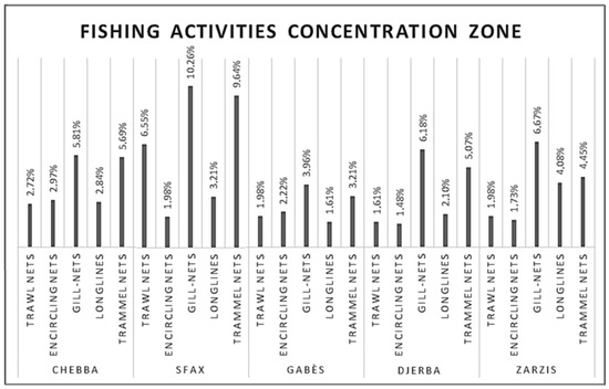 According to our survey, several boats use different fishing gears in different zones during the year. The fishing sailor is not generally loyal to a specific type of fishing gear, nor a specific fishing area. The distribution of fishing activity in the Gulf of Gabès is, therefore, not homogeneous. The concentration of fishing activities by type of gear in the most important fishing zones of the Gulf of Gabès (Chebba, Sfax, Gabès, Djerba, Zarzis) is illustrated in Figure 2.