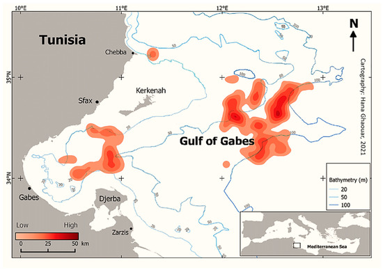 The surveys conducted with fishermen in various ports of the Gulf of Gabès have allowed us to gather the GPS positions of wrecks and abandoned fishing gears in the region. While this information may not be exhaustive, the spatial distribution mapping has provided us with insight into the extent of ALDFGs in the area. The map (Figure 3) reveals two significant concentration zones. The first is located at depths around 30 m south of Sfax and north of Djerba, while the second deepest lies at depths between 40 and more than 100 m along the Gulf of Gabès coasts. Nevertheless, a more comprehensive and long-term study involving other types of gears is essential, particularly along the Kerkennah island coasts, which appear to be heavily impacted by plastic traps posing a significant threat to the entire area [24].