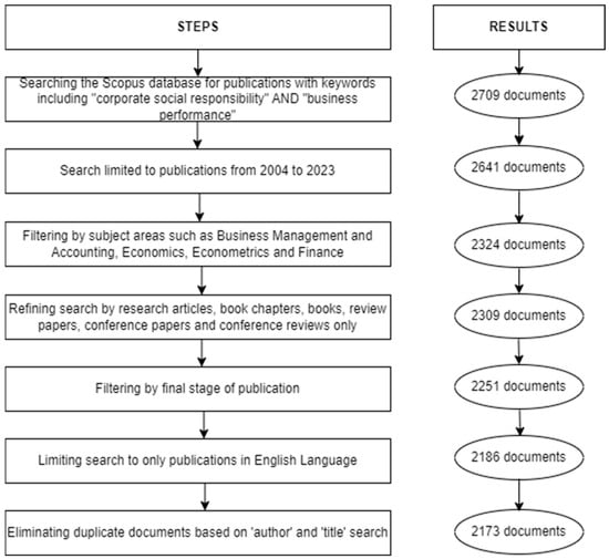 In exploring the existing literature on CSR and organizational performance in terms of the available studies in the Scopus database, a relevant keyword search query was conducted for a bibliographic review. The initial query included terms and abbreviations that were synonymous with “corporate social responsibility” and “business performance”. The query was conducted for search titles, keywords and abstracts, which were restricted to publications from 2004 or later. The query was conducted in Scopus on 24 November 2023. Hence, the eventual query herein referred to as Equation (1) was: