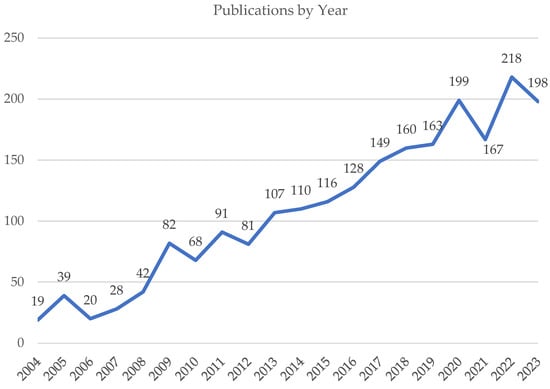 With regards to the time distribution based on the 2173 publications considered for analysis in this study, the breakdown shows that the peak year of scholarly activity in this area of study was reached in 2022 (with 218 publications), while the full year with the fewest publications was recorded in 2004 (with 19 publications). With at least 100 new publications each year from 2013 to 2023, there was a steady yearly rise from 2014 (95 documents) to 2018 (135 documents). The number of publications steadily rose from 2013, and the trend fell and rose sharply in 2021 and 2022, respectively. While the full number of output records in 2023 was not conclusive as of 24 November 2023 when the search was conducted, 198 publications were recorded, with the likelihood that there could be more publications before the end of the year. The general upward trend in recent years, however, suggests growing scholarly interest in this area of study, as earlier established by previous studies [29,30] and partly attributable to the growing opinion that pursuing CSR and sustainability is critical for a business’ long-term growth, competitiveness and survival [31,32,33]. The chart in Figure 3 illustrates the distribution according to the number of documents published per year.