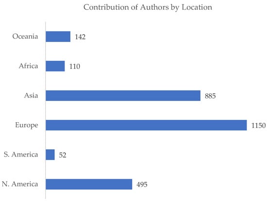 When it comes to contribution by geographical location, the analysis shows that Europe had the highest number of publications (1150), followed by Asia (885), North America (495) and Oceania (142). This reinforces a similar finding by [34] and emphasizes the leading role of these continents in this area of research and further to the fact that research related to CSR and business performance is growing in popularity in these areas. Africa (110) and South America (52) recorded the fewest studies in this area, although there were 64 other publications for which continent of publication was unaccounted for. A possible explanation for the high productivity of Europe, Asia and North America in this area may be due to the strong emphasis on CSR and sustainability in those contexts [35,36]. Described by [37] as two of the continents with the highest levels of poverty, Africa and South America’s low contributions to this research area reflect a geographical gap in CSR and organizational-performance-related research and further suggest that more research attention is needed in these areas to improve knowledge on the practice of CSR and sustainability on those continents. Future research efforts and funding may thus be directed to these geographical areas to address these gaps. Figure 4 summarizes the breakdown of geographical contributions over the period under review.