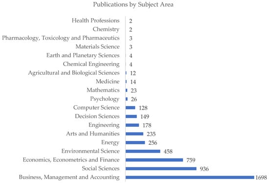 From the perspective of subject area, Business-, Management- and Accounting-related publications constituted about 35% (1698 publications) of the distribution. Other top contributing subject areas included 19% (936 publications) Social-Science-related publications and 16% (759 publications) Economics-, Econometrics- and Finance-related literature. This emphasizes human, social and organizational behaviour and economic and market systems, as well as a management-science-related focus. The other subject areas included Environmental Science (9% or 458 publications), Energy (5% or 256 publications), Arts and Humanities (5% or 235 publications), Engineering (4% or 178 publications), Decision Sciences (3% or 149 publications) and Computer Science (3% or 128 publications). The others included Psychology (26 items), Mathematics (23 items), Medicine (14 items), Agricultural and Biological Sciences (12 items), Chemical Engineering (4 items), Earth and Planetary Sciences (4 items), Materials Science (3 items), Pharmacology, Toxicology and Pharmaceutics (3 items), Chemistry (2 items) and Health Professions (2 items), which all together constituted less than 2% of the distribution. While other similar reviews [38,39] had comparable findings of the dominance of these subject areas in the field of CSR-related research, one of the reasons may be attributed to the interdisciplinarity of the concept of CSR and sustainability and how its implications are primarily central to the diverse concepts studied in these disciplines [40,41]. Figure 5 illustrates the number of publications by subject area.
