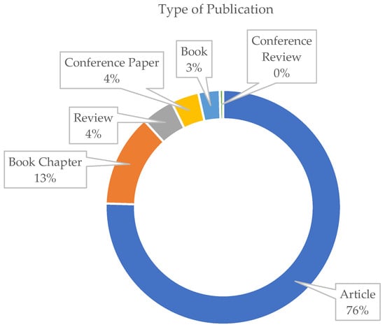 The types of publications reviewed were categorized into six groups: research articles, book chapters, books, review papers, conference papers and conference reviews. Out of the 2173 items used for this analysis, 76% of them were research articles, 13% were book chapters, 4% conference papers and 4% review papers. The others were conference papers (4%) and conference reviews (0%). Figure 6 presents a graphical summary of the publications by type.