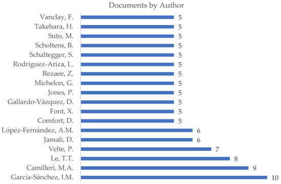 When it comes to the most prolific authors with at least five publications in Scopus on CSR and business performance over the period of this analysis, eighteen authors were highlighted by this analysis, out of which twelve had published at least five papers, two authors published six papers and one each published seven, eight, nine and ten papers, respectively. The top six most productive authors in this regard included Garcia-Sanchez (10 publications), Camilleri (9 publications), Le (8 publications), Velte (7 publications), Jamali (6 publications) and Lopez-Fernandez (6 publications), who together published a total of forty-six items. Recent publications like [34,38] also identified Garcia-Sanchez of the University of Salamanca as one of the top authors in this area. This may be indicative of the important emphasis placed on issues around CSR, especially within the contexts from which these authors conduct their studies. Another possible explanation of this development may be the authors’ expertise and specialization, access to resources, institutional support and collaborative networks [42,43]. The detailed illustration of the contributions by authors with at least five publications over the period is presented in Figure 7.