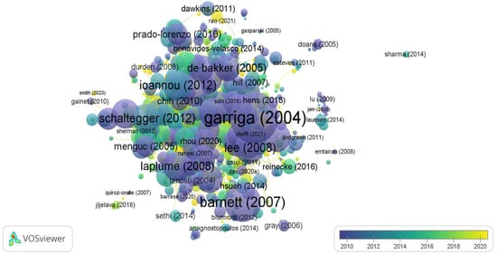 This method is used to map out author relationships or connections based on citations. According to [44], the CNA method helps with detecting the scientific structure of a field of study based on the trends in the citation practices among the authors in that field. In conducting this analysis, the VOSviewer software version 1.6.20 was used to extract the trends in how previous studies have shaped the networks of current ones by their main topic of focus. The analysis of the main themes common to the publications with the highest numbers of citations in each cluster reveals a diverse, wide-ranging and contextual overview when it comes to the subject matter of CSR and business performance.