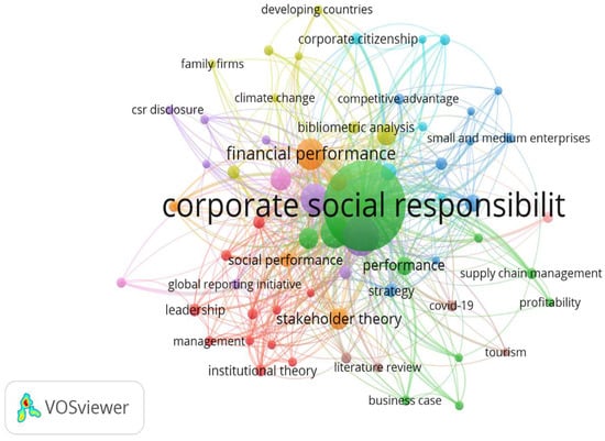 Keywords have been used to summarize the content of the publications and as a pointer to the hotspots and topics in specific fields [98,99]. From Figure 10, the analysis shows that the most used keyword was “corporate social responsibility”, although there were other emerging ones such as “financial performance”, “social performance”, “performance”, “leadership” and “stakeholder theory”. These keywords include “developing countries”, “climate change”, “CSR disclosure”, “tourism”, “business case”, “small and medium enterprises” and “profitability”. These less popular keywords suggest areas that authors have not explored much and which signal possible research gaps and new directions.