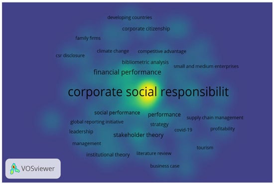 This analysis shows a density map derived from an examination of the most popular keywords among the authors, as depicted by a heatmap using VOSviewer software version 1.6.20. With two colour gradients, the density map shows the intensity of the data points around the most common author keywords around CSR and business performance over the period from 2004 to 2023. The brighter the colour and the bigger the font of a keyword, the more popular the research around that term has become among authors [28]. Similarly, as the colour and font size fades, the research around that keyword becomes less frequent, and this points to the likelihood of such areas being less explored [96,97]. Figure 10 presents a connection map based on the frequently used keywords.